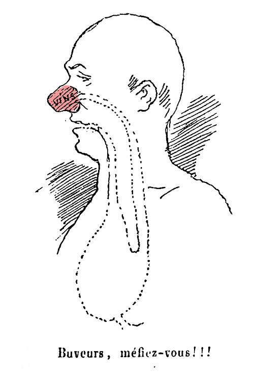 I 1871 forklarte Bertall i sin tegning at alkohol blir også sittende i nesen og i luftveiene! Vil du lese mer om Bertall, kan du klikke her